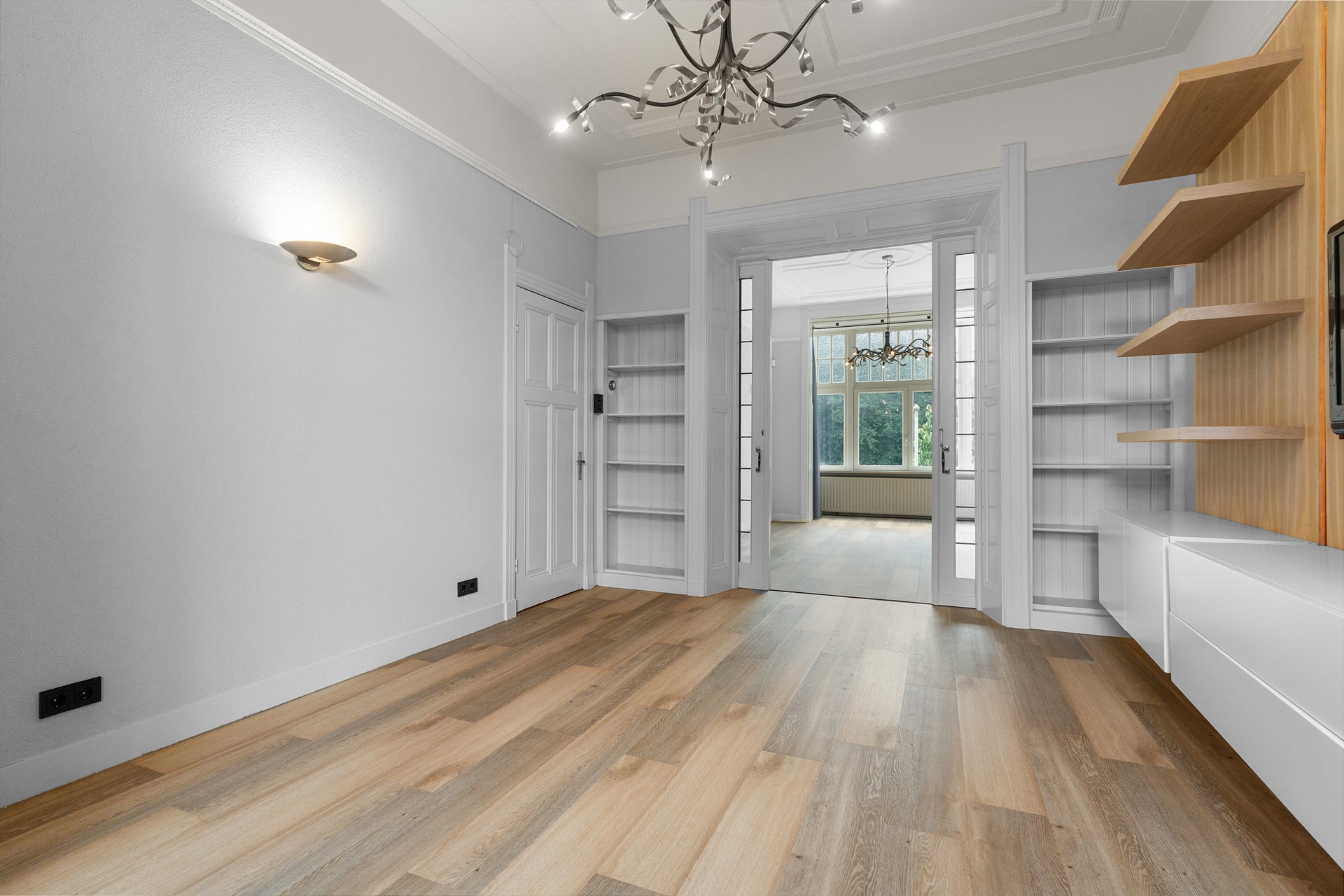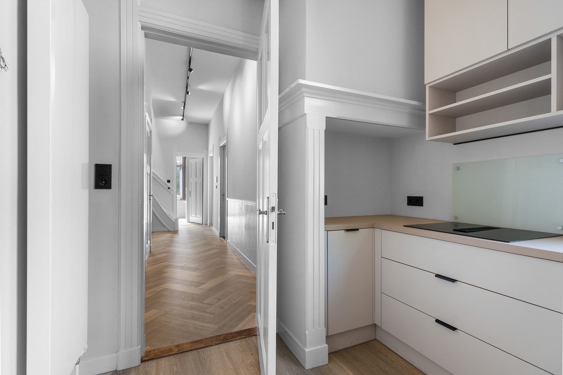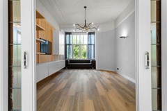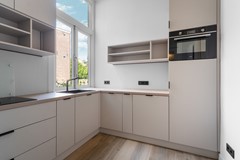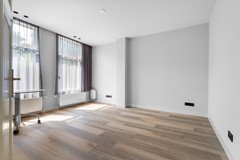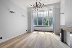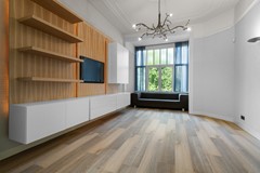 Riante woonkamer ensuite (ca. 45 m²) met prachtige erker, luxe toiletruimte en een moderne gesloten keuken met hoogwaardige inbouwapparatuur. Aan de voorzijde een extra (slaap)kamer dan wel werkkamer.