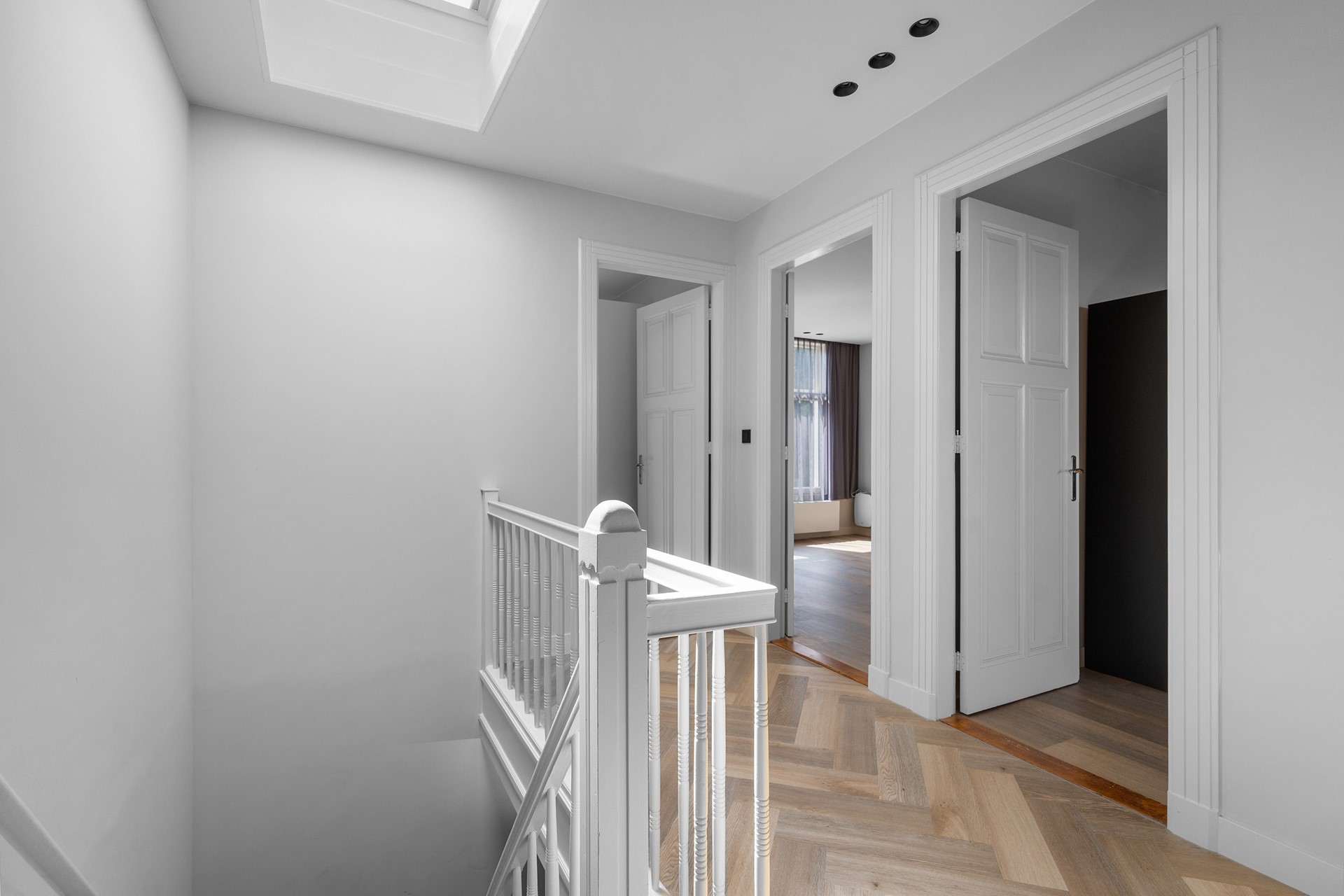 Vier volwaardige slaapkamers, waarvan één met eigen badkamer en een balkon. Tweede ruime badkamer, apart tweede toilet en ook nog een aparte was- en strijkruimte.