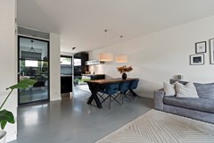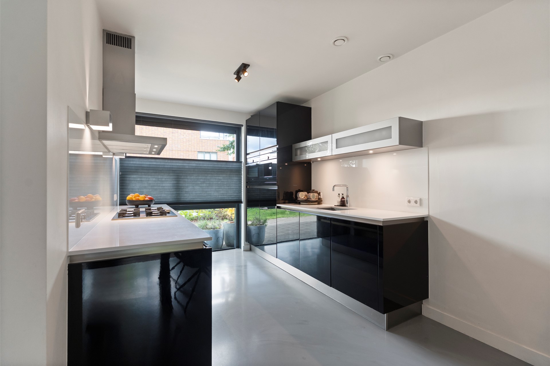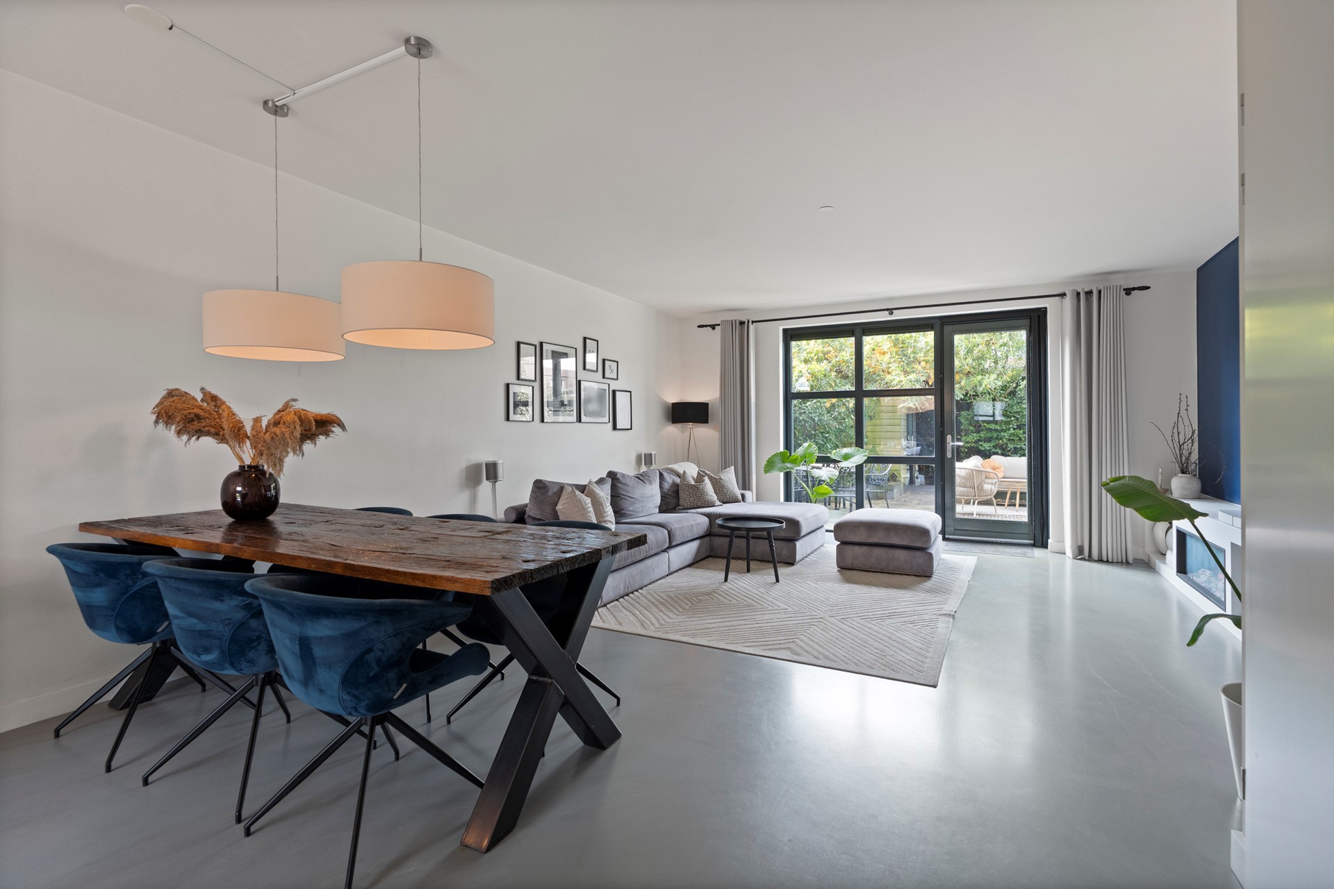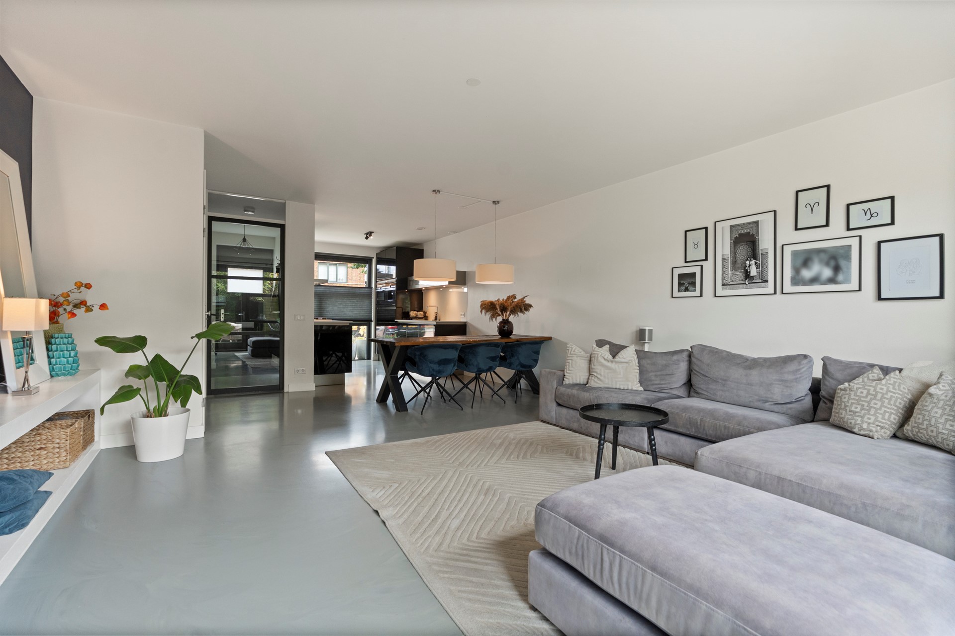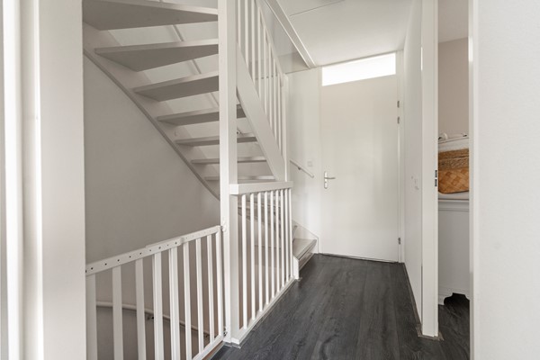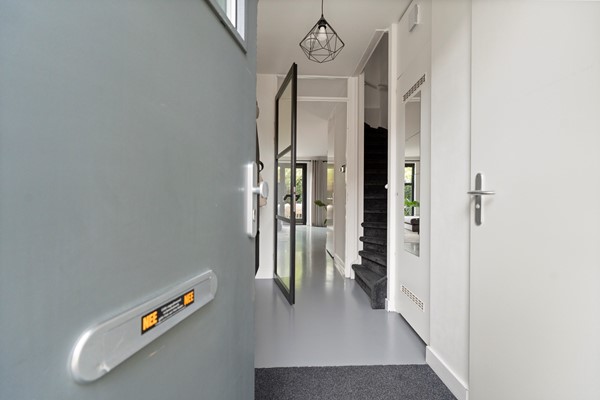 Entree, hal met modern toilet, meterkast en trapopgang. De woonkamer is heerlijk licht dankzij de grote, hoge ramen en de deur naar de tuin. De strakke gietvloer met vloerverwarming loopt door in hal en keuken. Praktische trappenkast voor extra bergruimte.