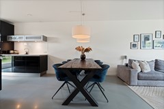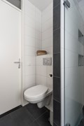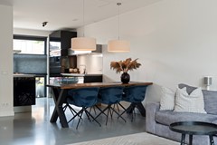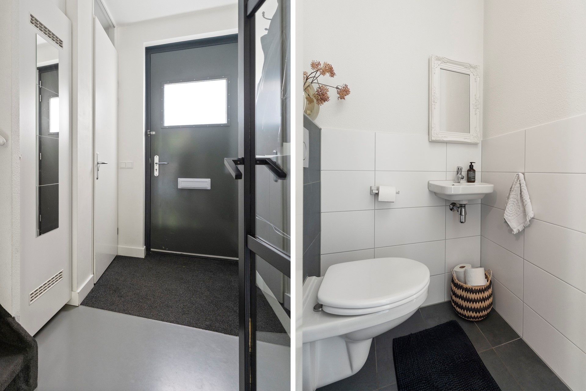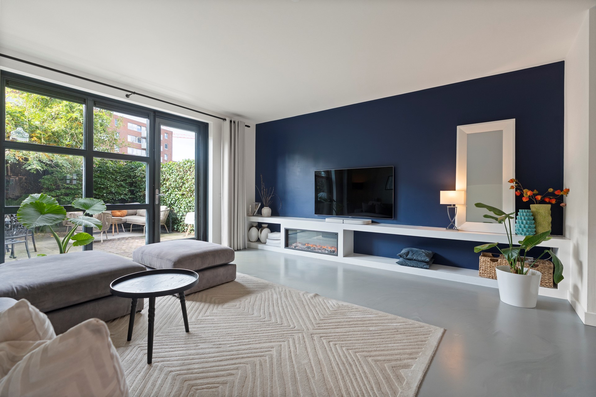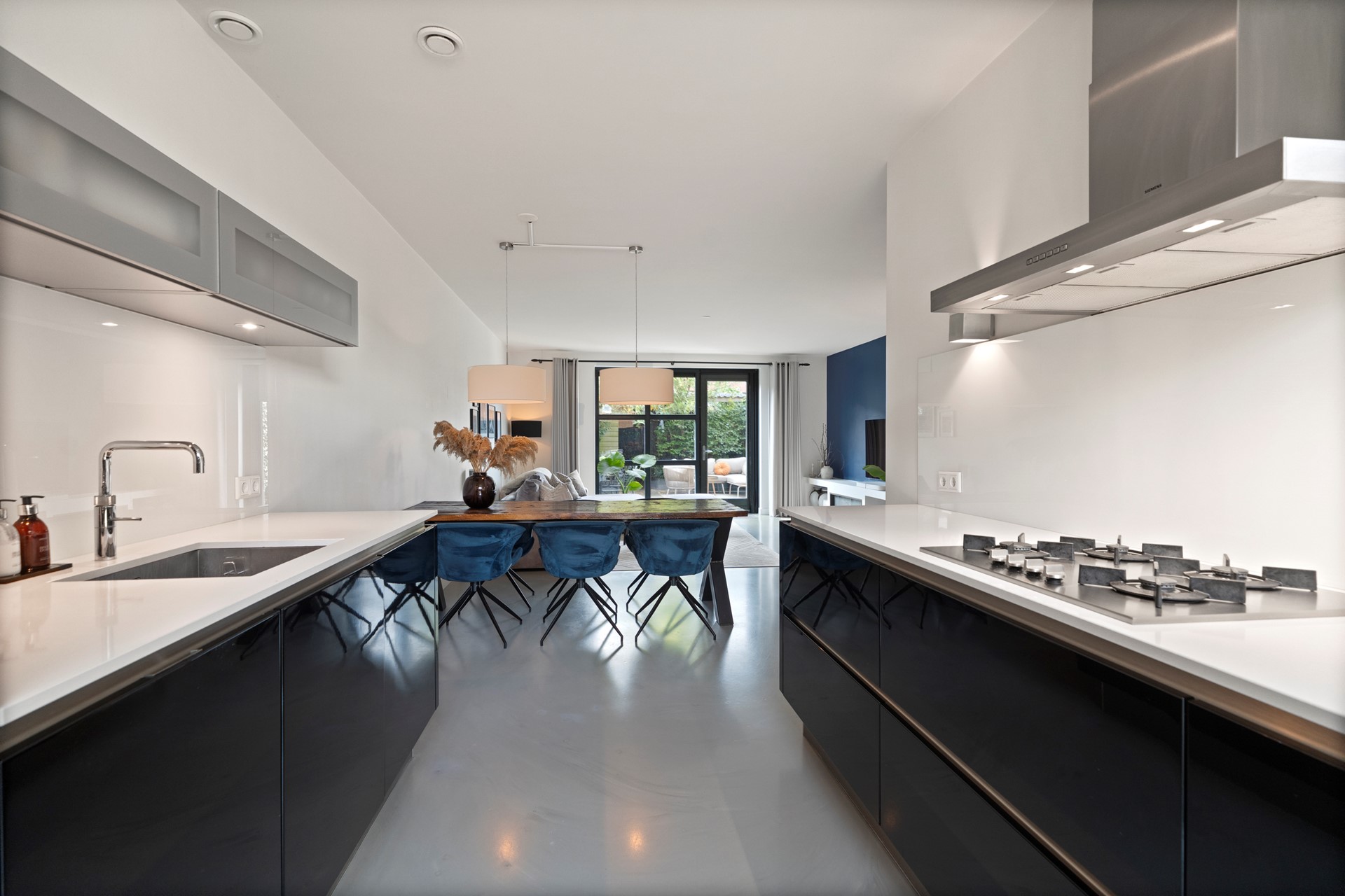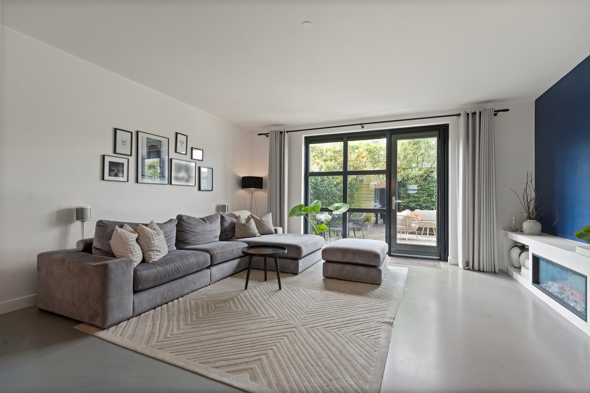 Entree, hal met modern toilet, meterkast en trapopgang. De woonkamer is heerlijk licht dankzij de grote, hoge ramen en de deur naar de tuin. De strakke gietvloer met vloerverwarming loopt door in hal en keuken. Praktische trappenkast voor extra bergruimte.