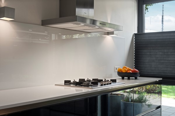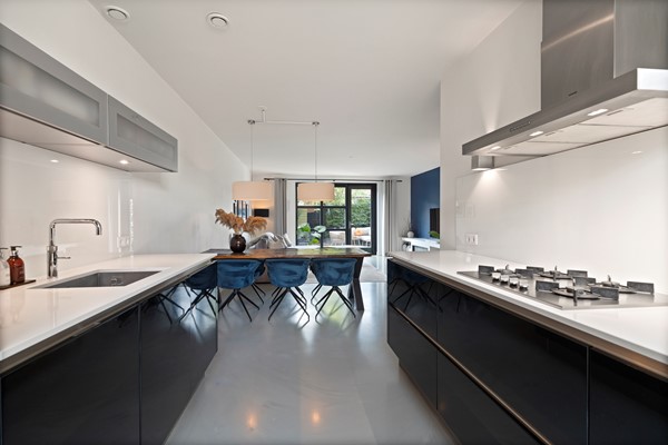 De open keuken strekt zich uit langs twee lange wanden in een royale opstelling en is