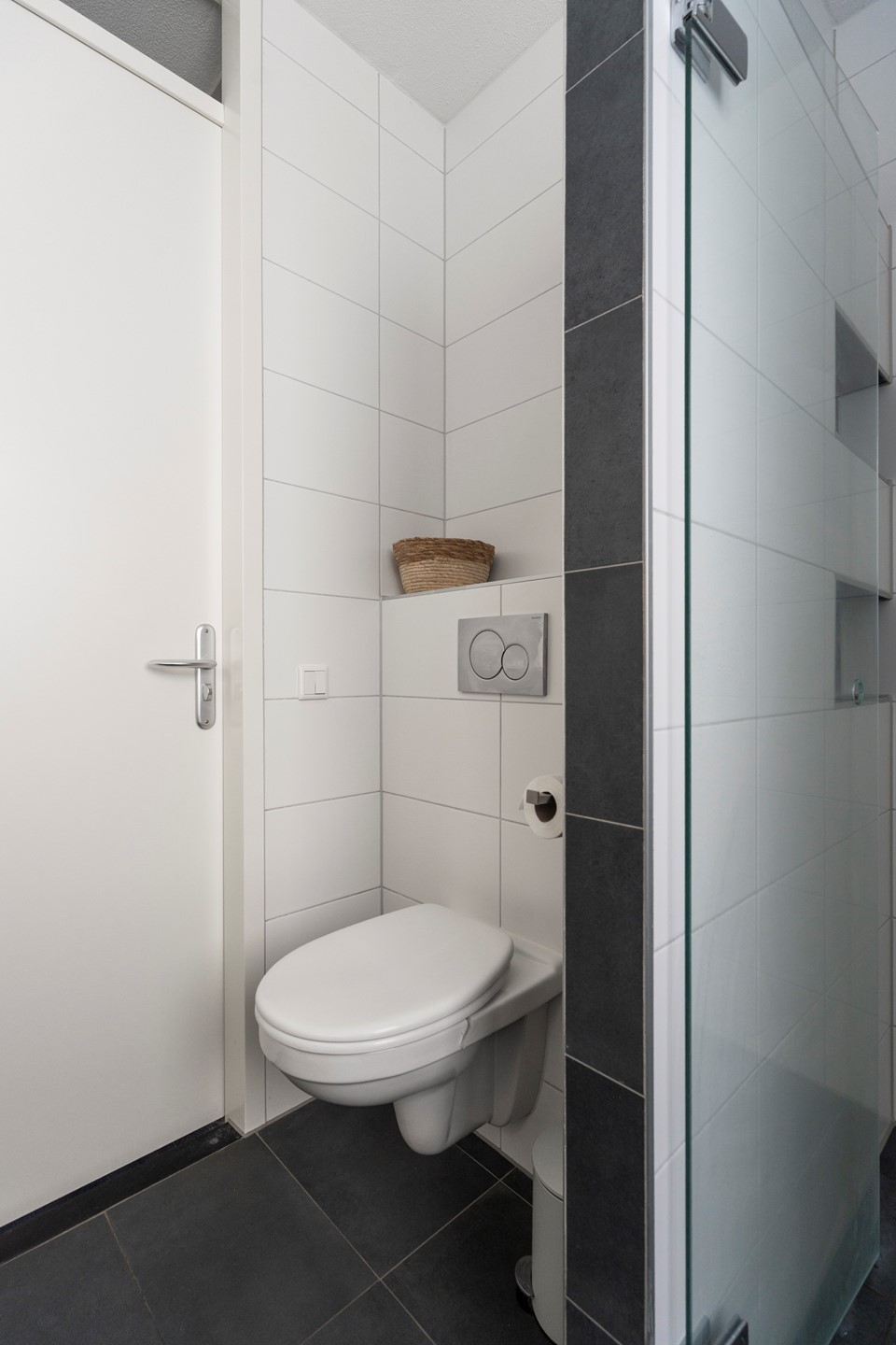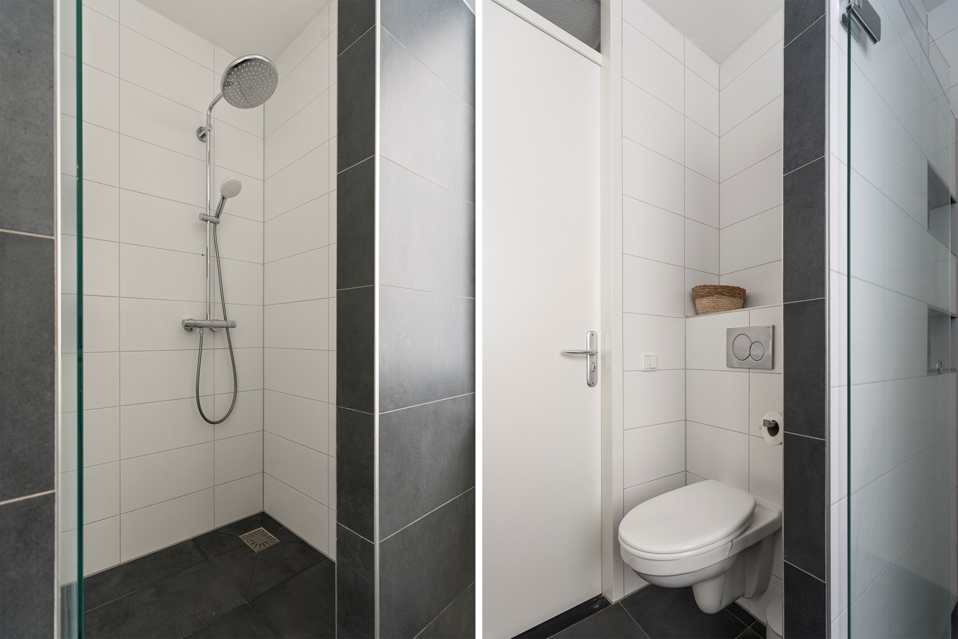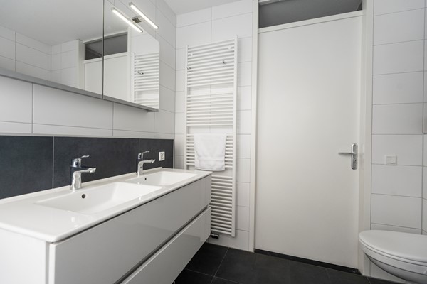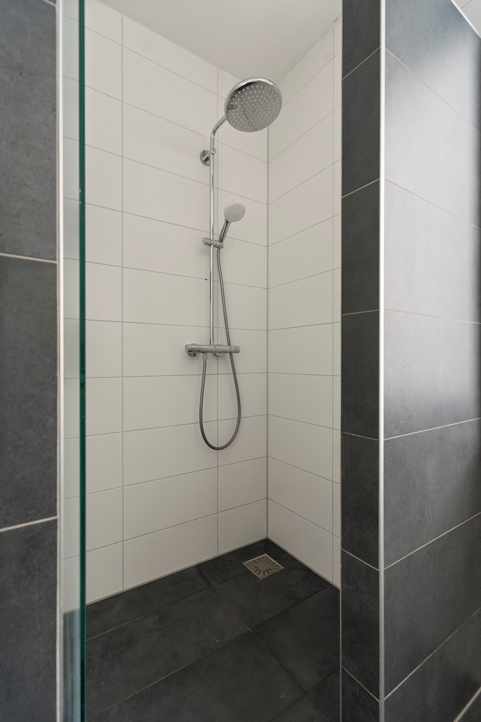 Overloop, badkamer met douche, wastafelmeubel en tweede toilet. Twee slaapkamers, waarvan de grootste aan de achterzijde ligt.