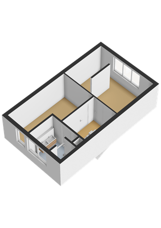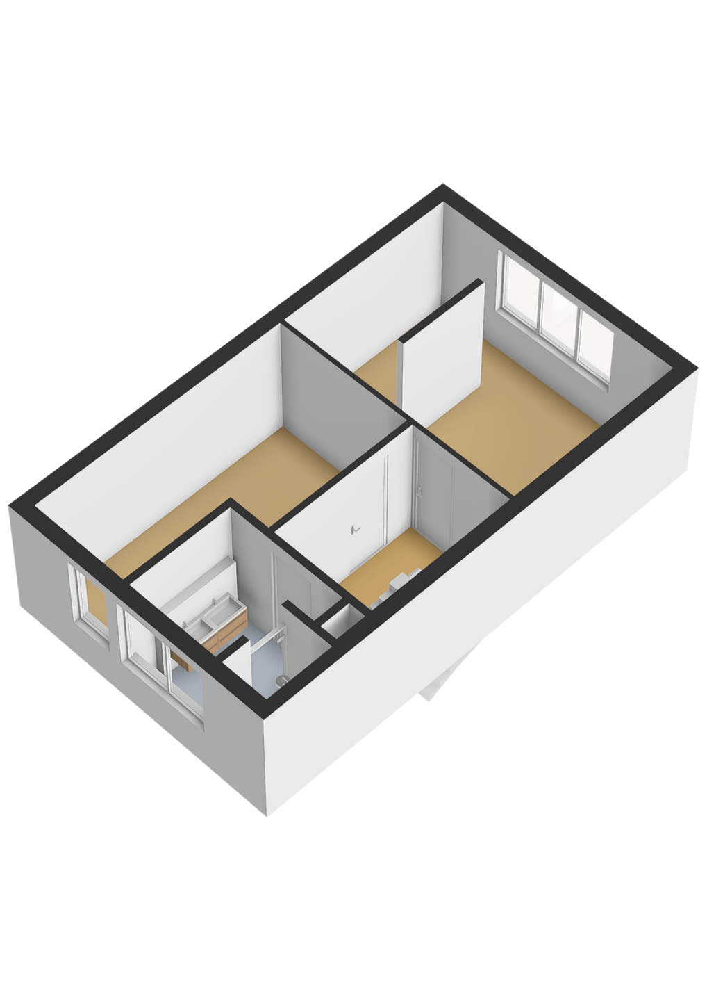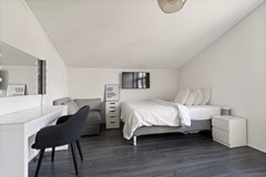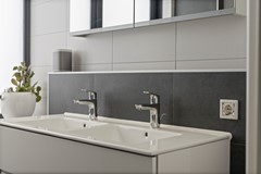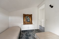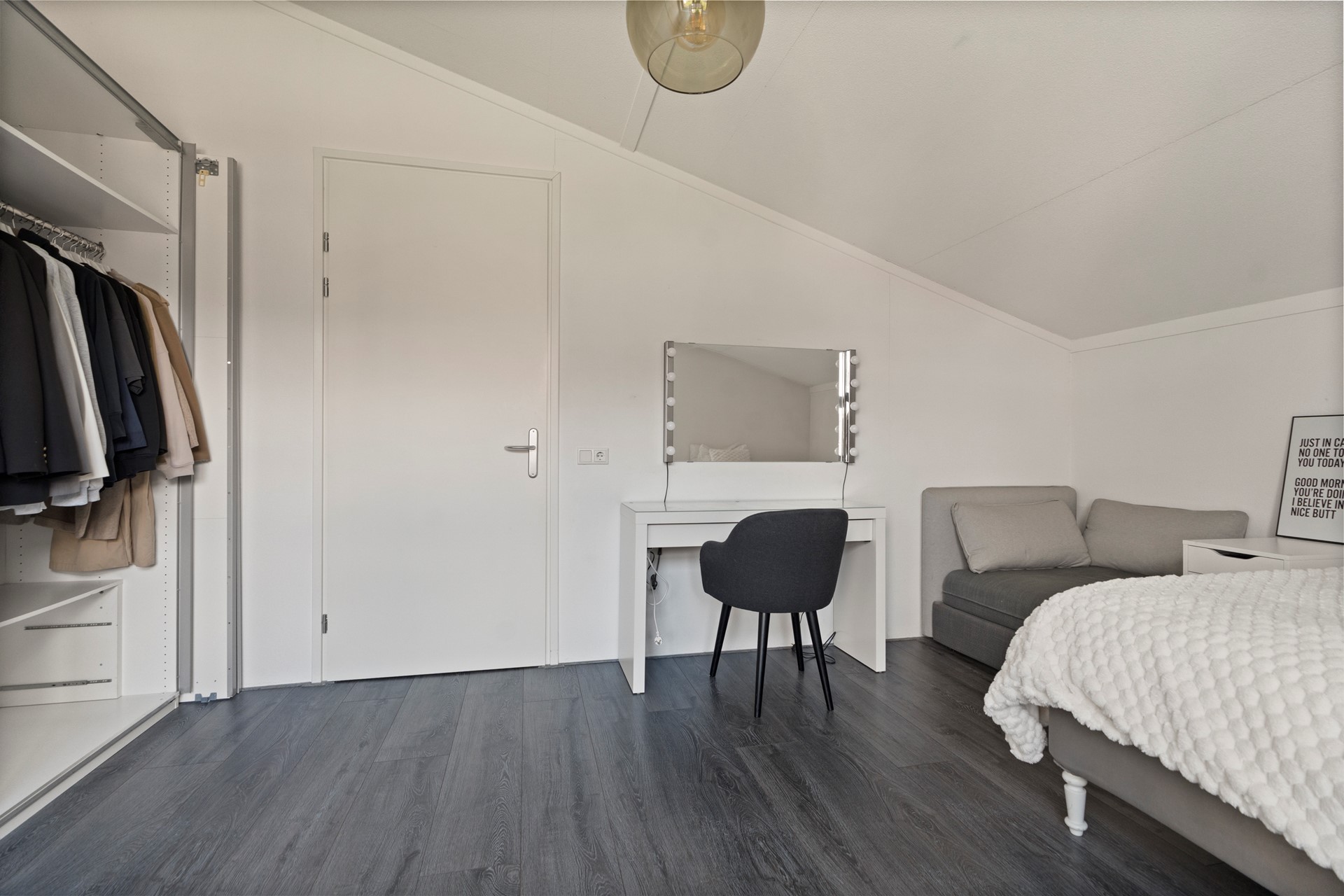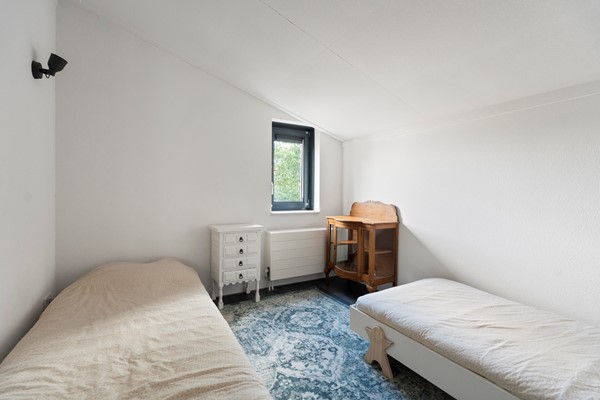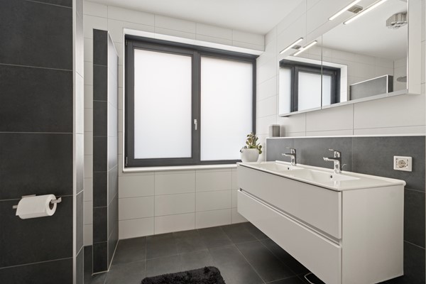Overloop, badkamer met douche, wastafelmeubel en tweede toilet. Twee slaapkamers, waarvan de grootste aan de achterzijde ligt.