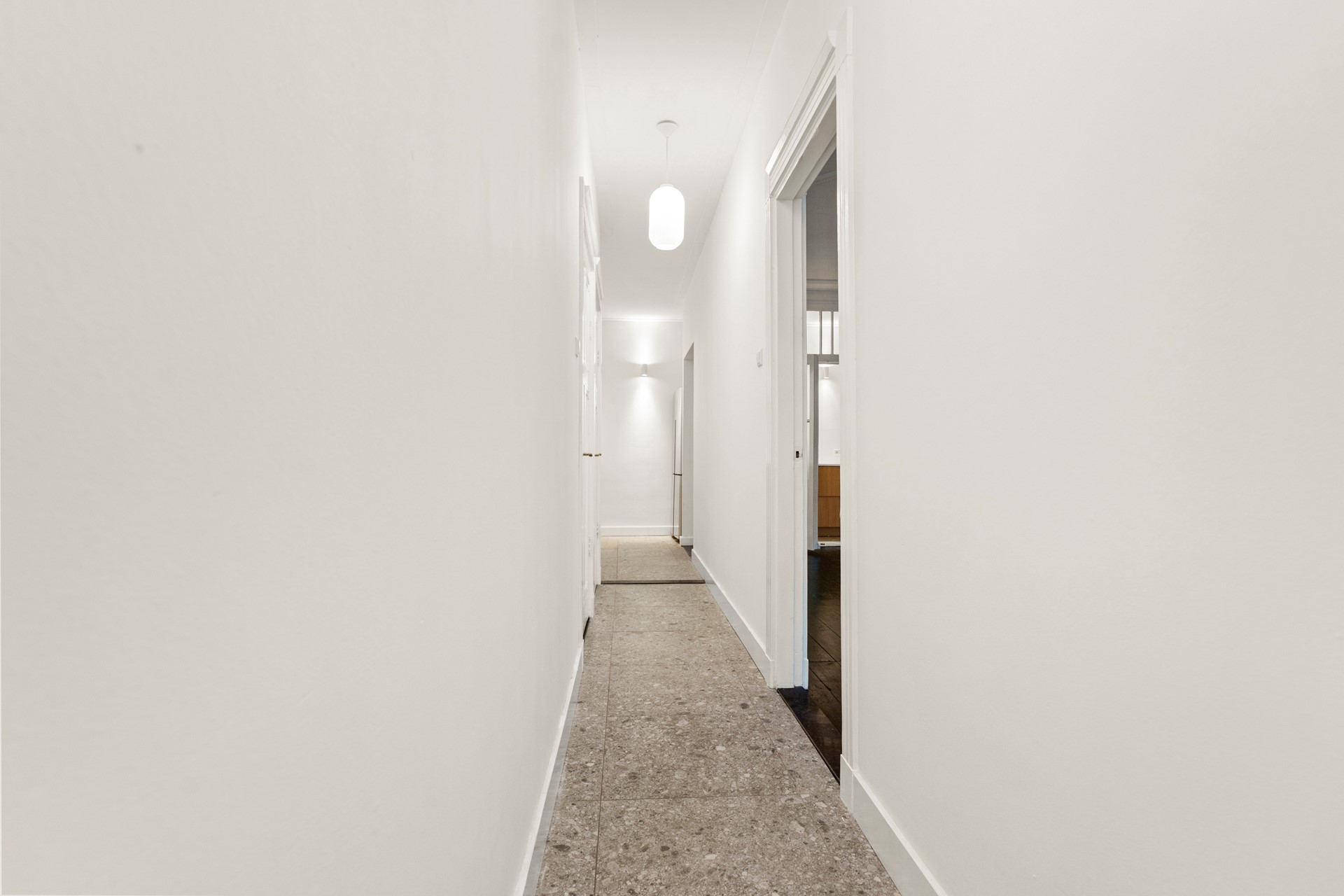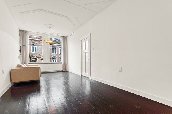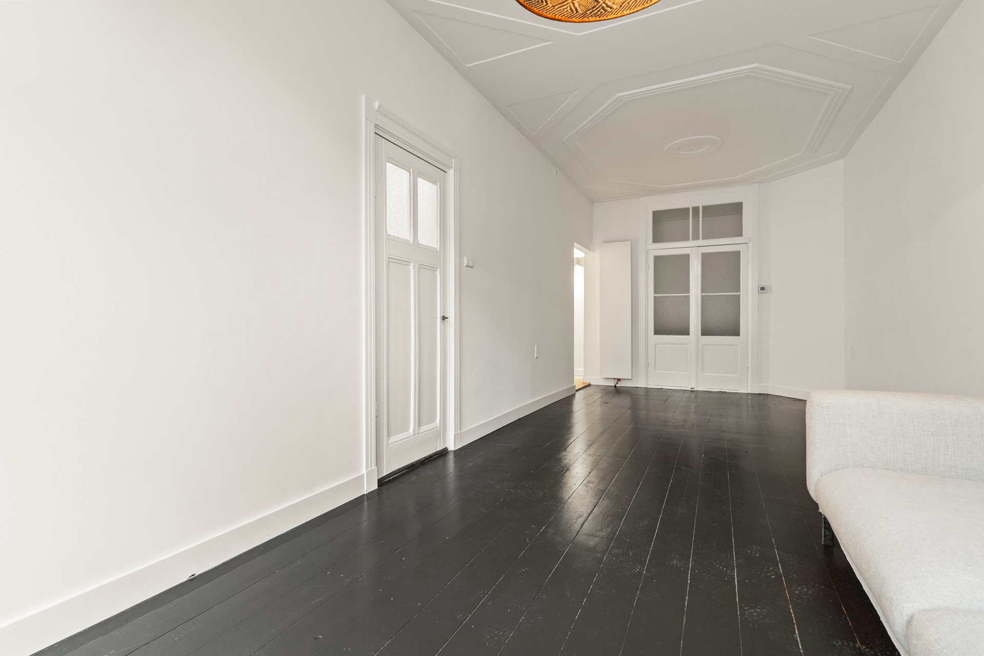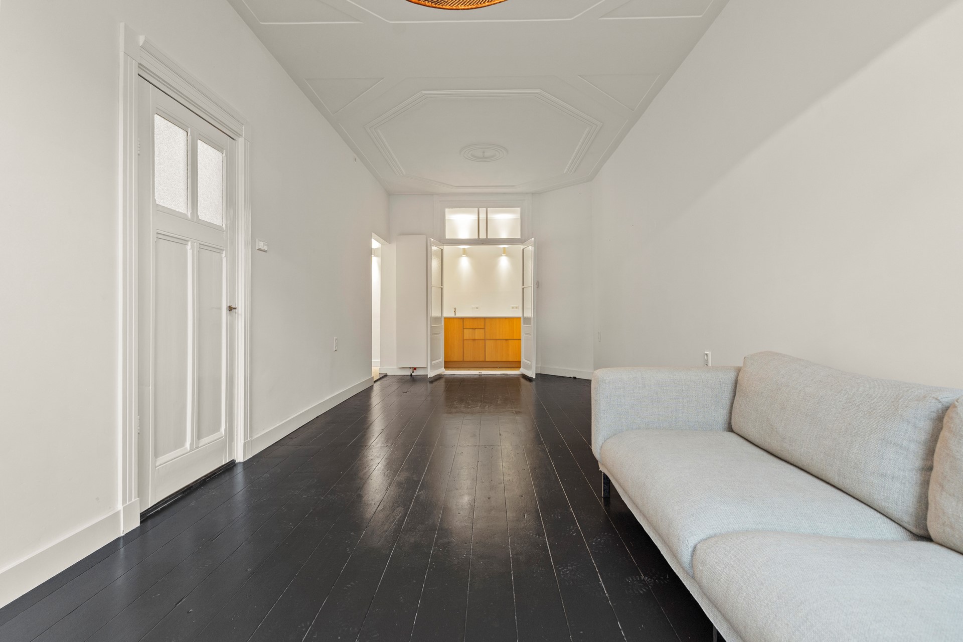 Begane grond: entree, hal met toilet, Lichte ruime woonkamer met ornamenten plafond (enkel glas, restant van de woning dubbel glas) en een directe toegang naar de moderne keuken met inbouwapparatuur.