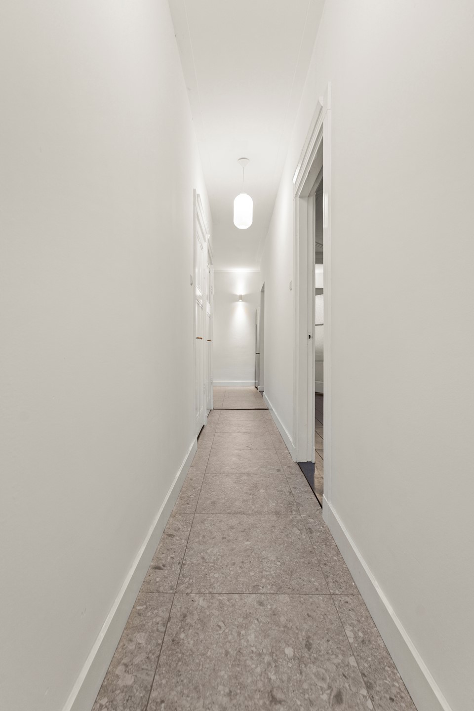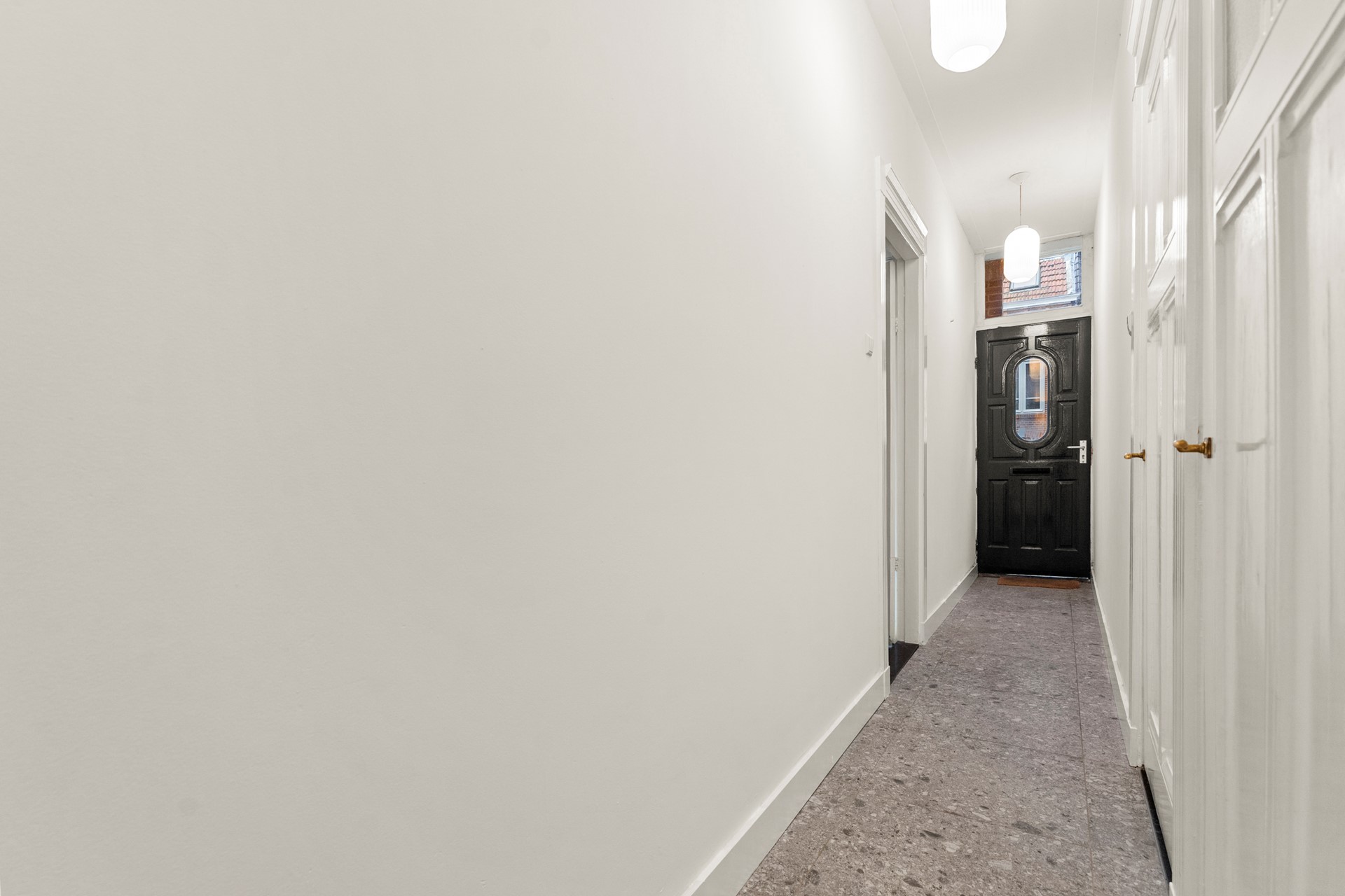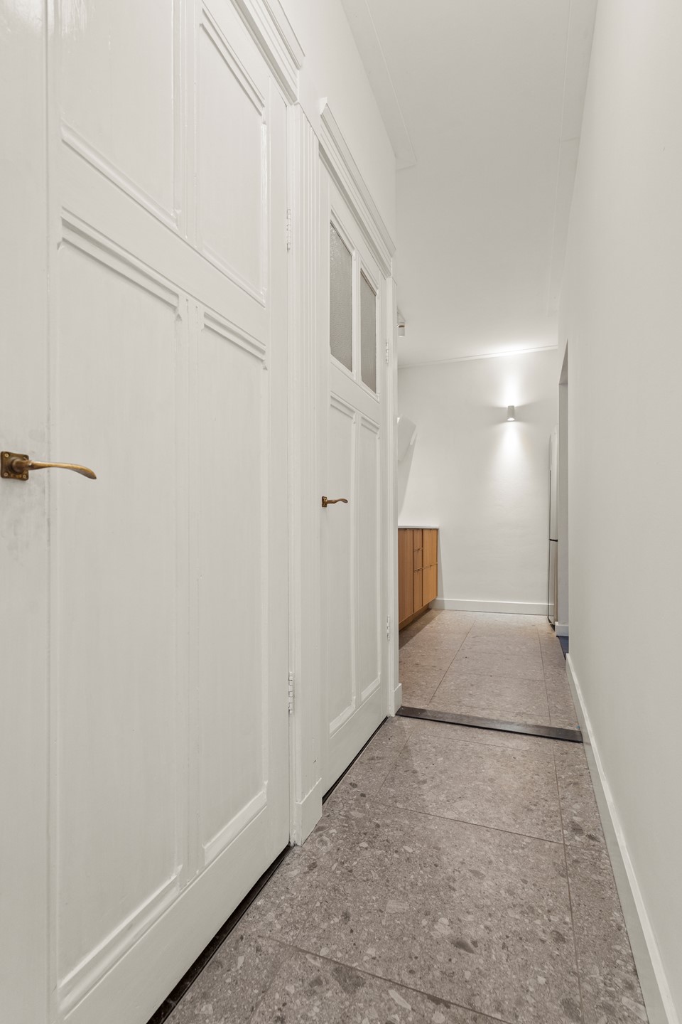 Begane grond: entree, hal met toilet, Lichte ruime woonkamer met ornamenten plafond (enkel glas, restant van de woning dubbel glas) en een directe toegang naar de moderne keuken met inbouwapparatuur.
