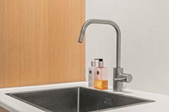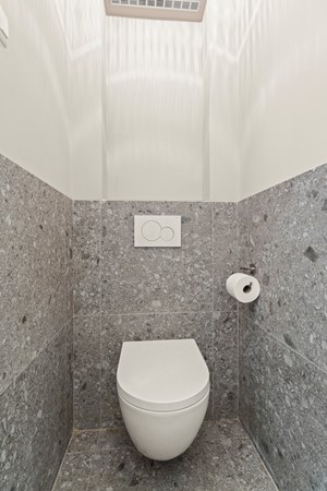 De bewoner komt direct binnen aan de keukenzijde met een keurige maar eenvoudiger keuken en een fijne ruime woonkamer met veel licht. In de vloer van de keuken is gekozen voor een grappige architectonische bijzonderheid: er is een glazenbeloopbare ruit in aangebracht zodat er ook licht van boven naar beneden zichtbaar is geworden. Ook is er een toiletruimte.