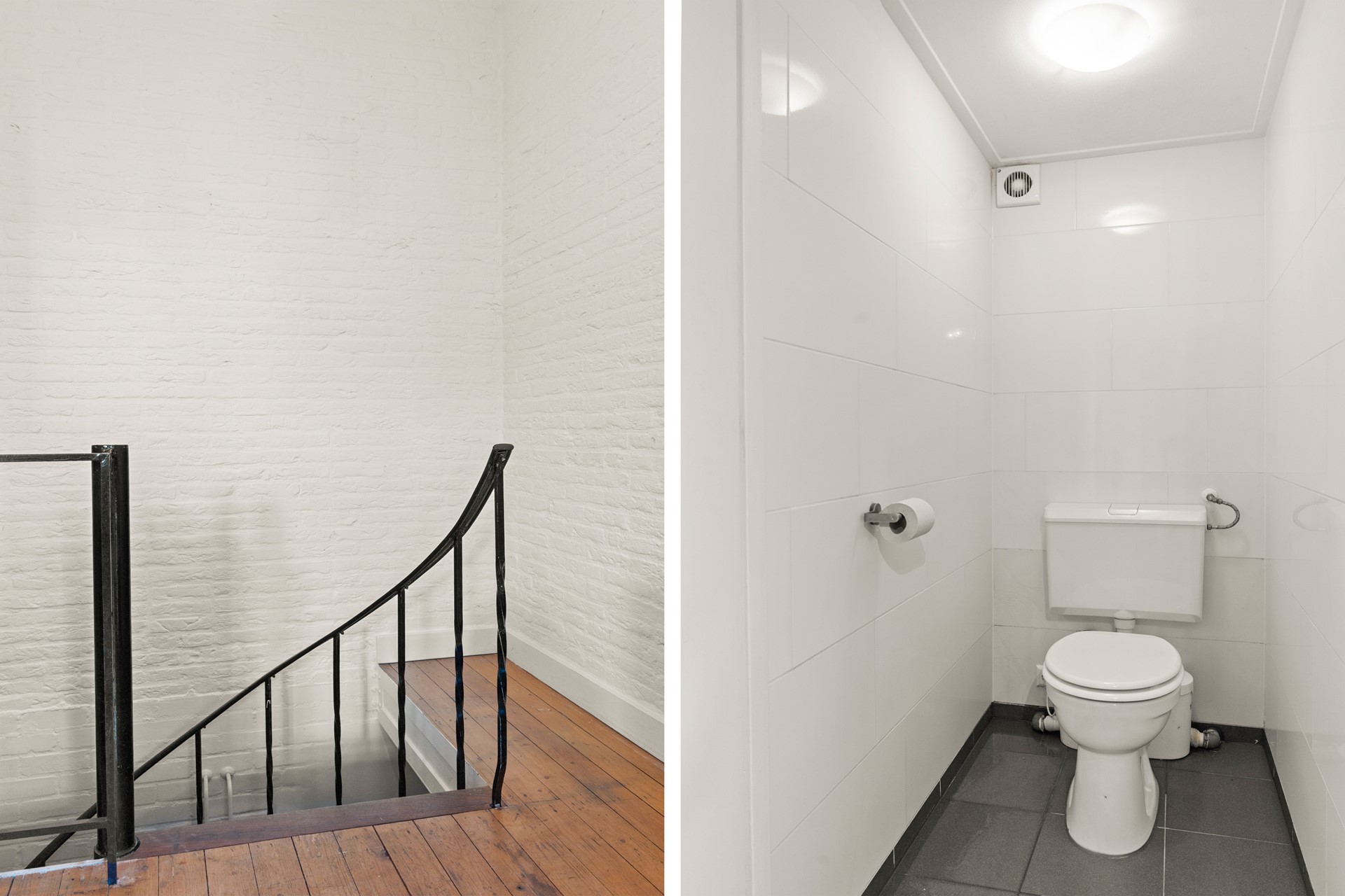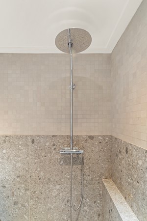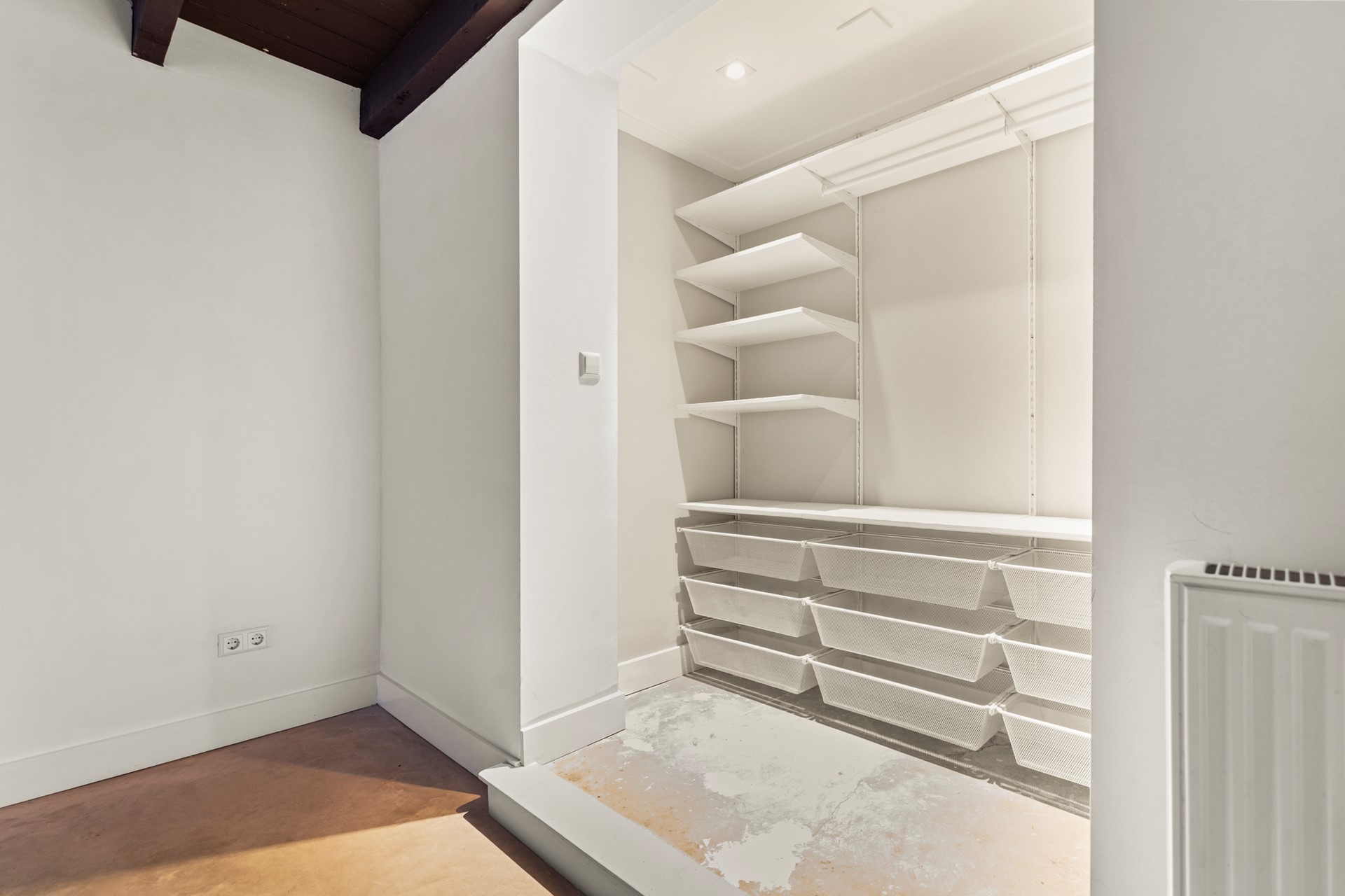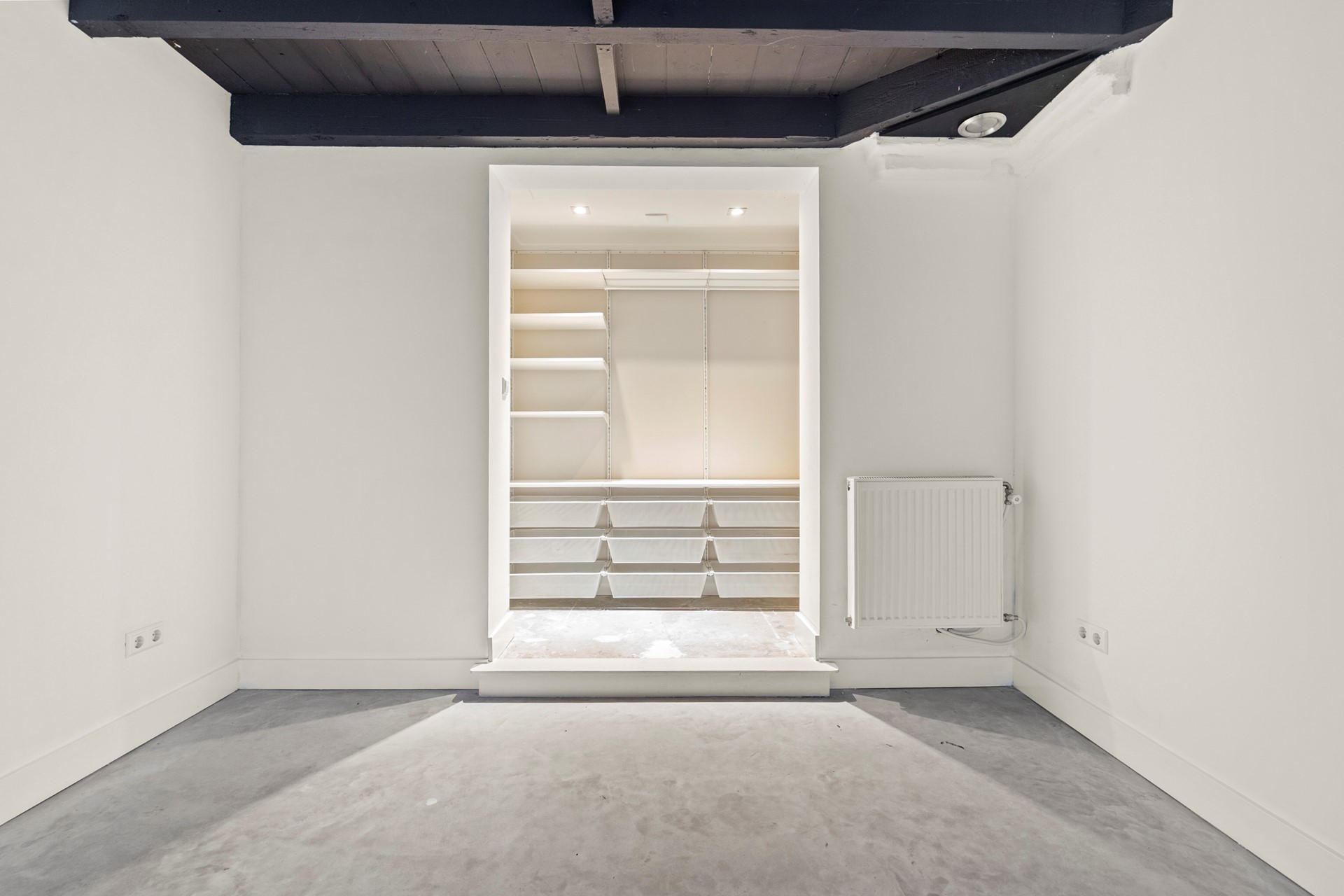 Er is een trap naar beneden een douche en een wastafel. Een van de slaapkamers heeft een raam met een beluchtingsmogelijkheid voor buiten, de andere ruimte is een binnenkamer die mogelijk wel als logeerruimte, opslag of kleedkamer gebruikt kan worden.