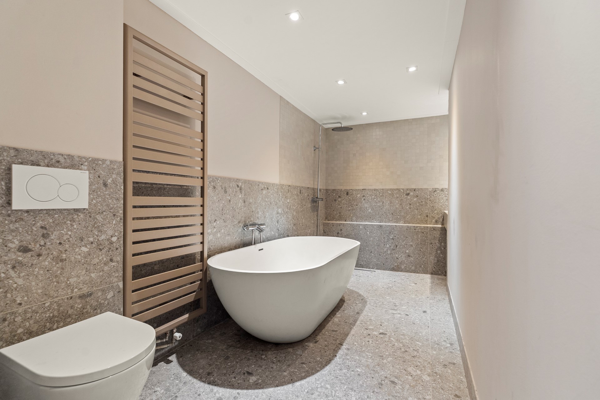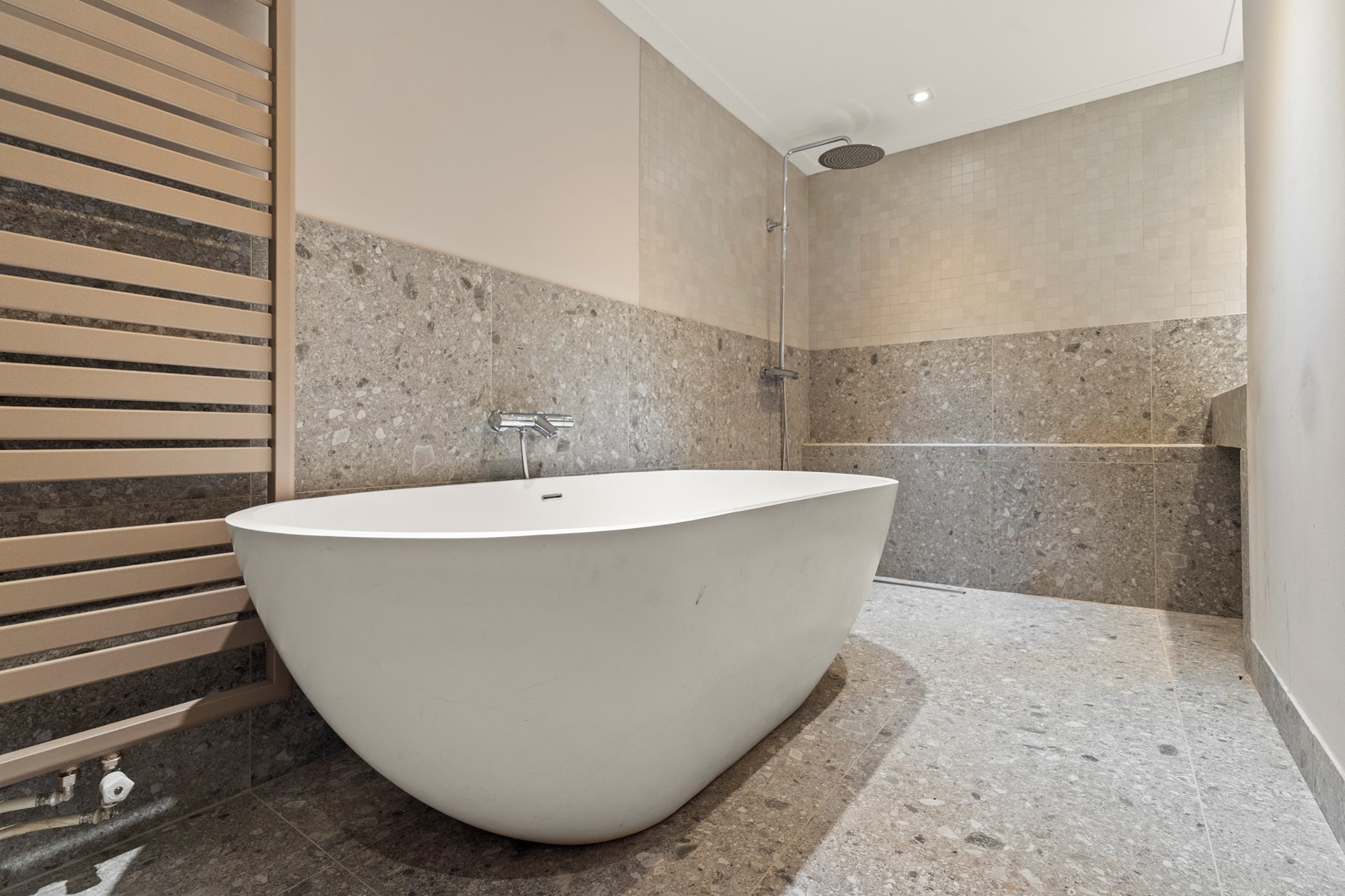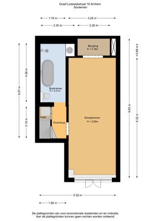 Er is een trap naar beneden een douche en een wastafel. Een van de slaapkamers heeft een raam met een beluchtingsmogelijkheid voor buiten, de andere ruimte is een binnenkamer die mogelijk wel als logeerruimte, opslag of kleedkamer gebruikt kan worden.
