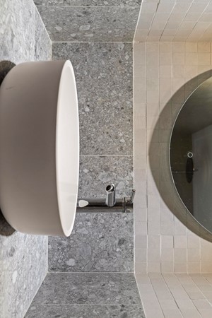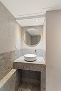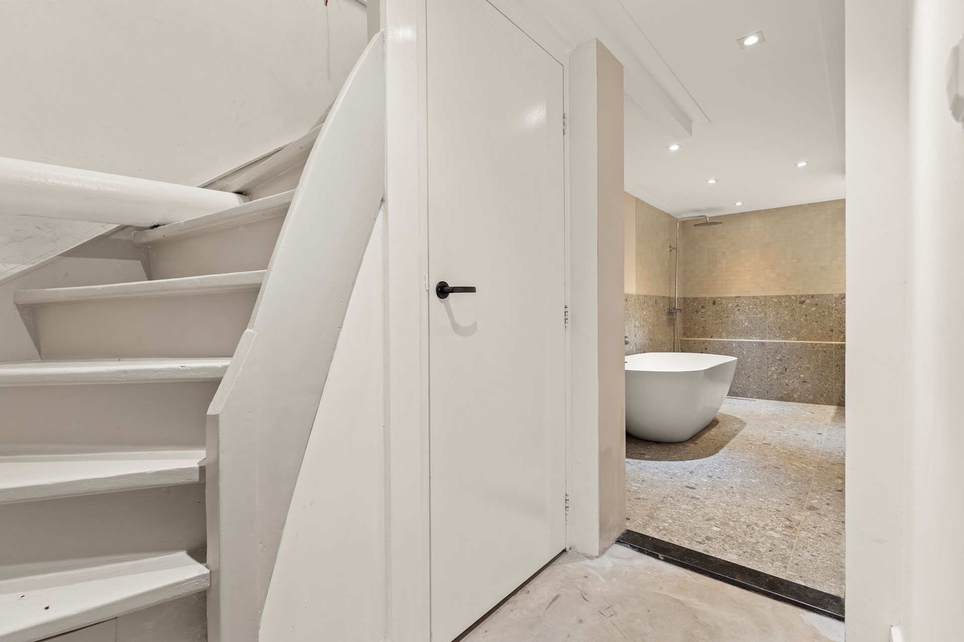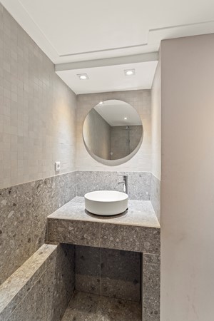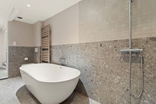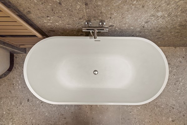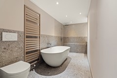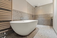 Souterrain: In het souterrain bevindt zich de zeer grote slaapkamer met directe toegang naar buiten en een prachtige betonnen vloer. Ook de hier gesitueerde fraaie grote badkamer met ligbad, aparte inloopdouche en wastafel combinatie geven de woning een hedendaagse sfeer van moderne strakke vormgeving.