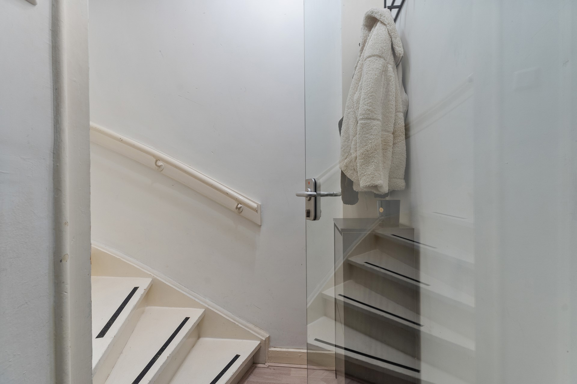 Centrale entree met deurbel, brievenbussen en trapopgang.