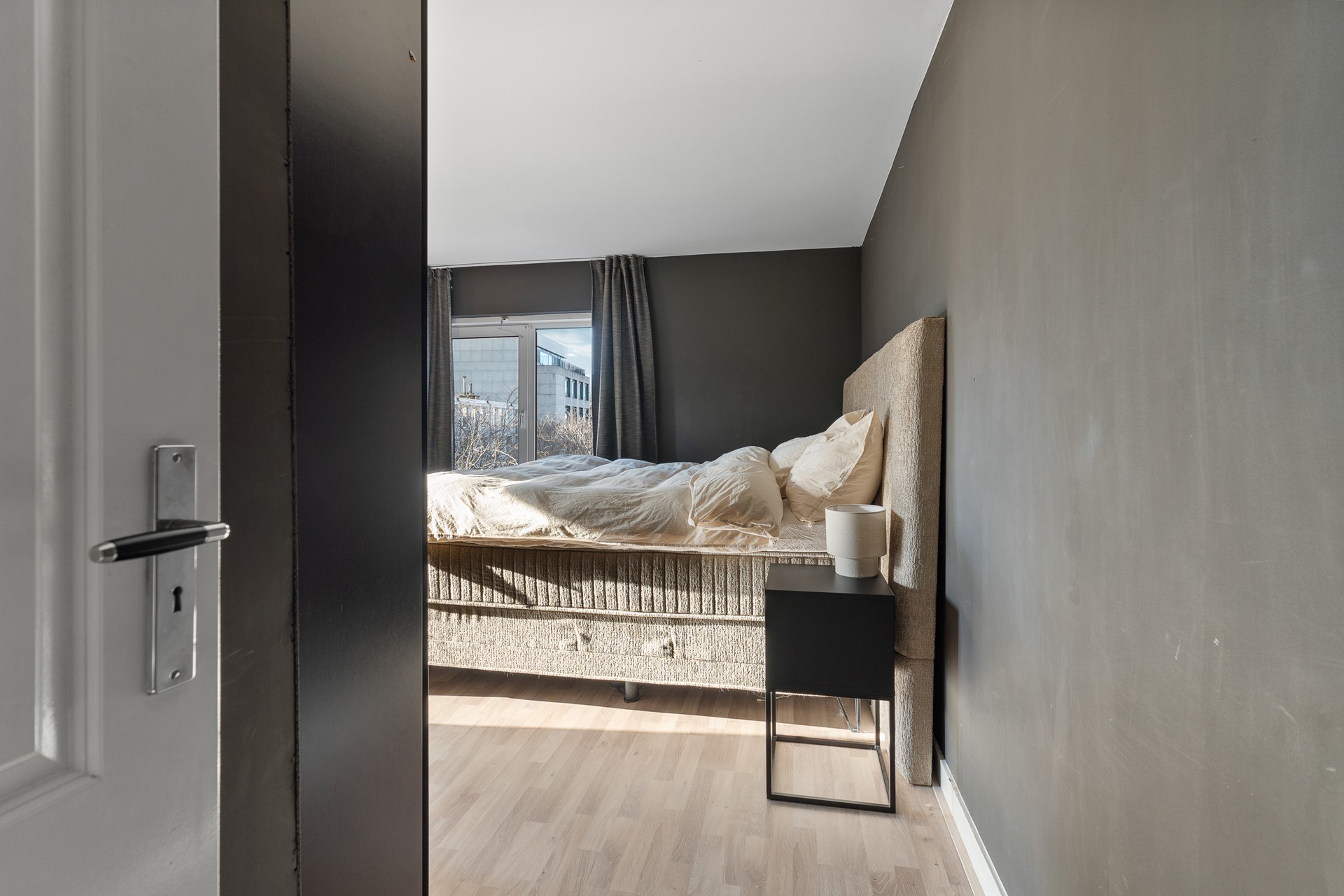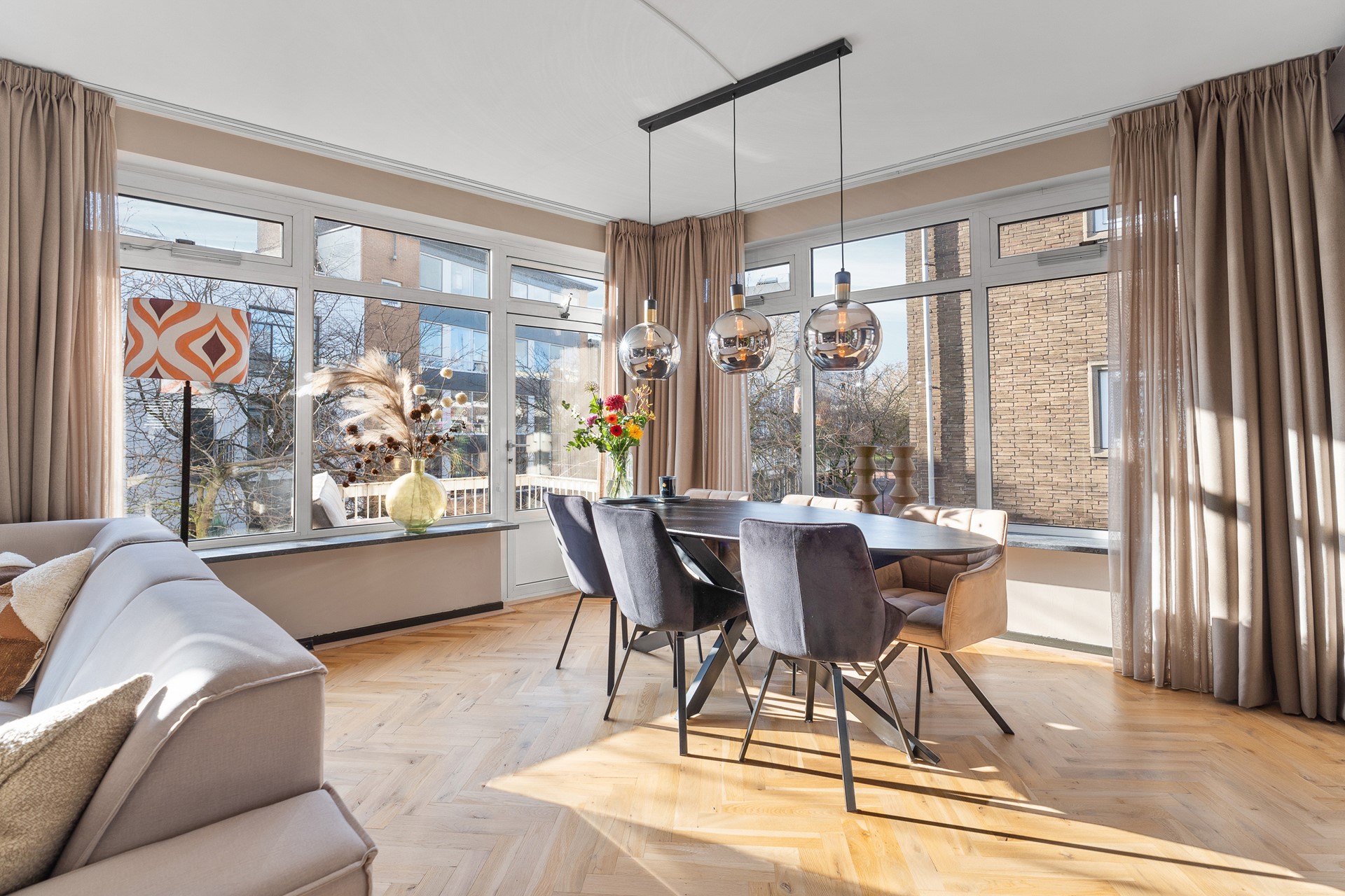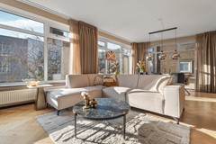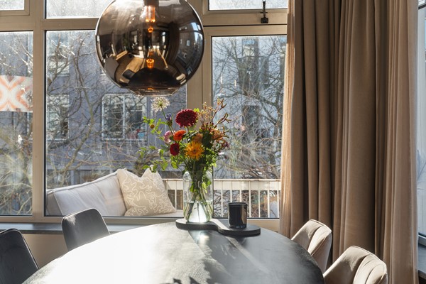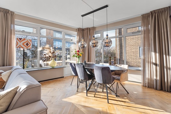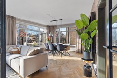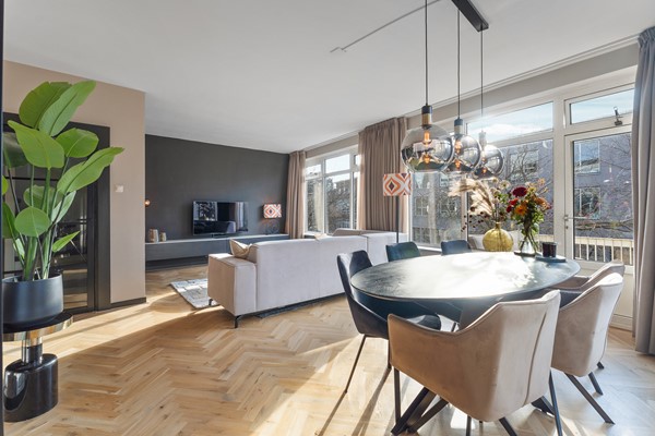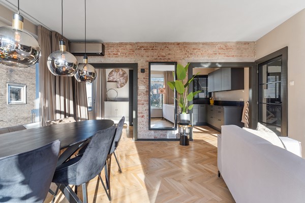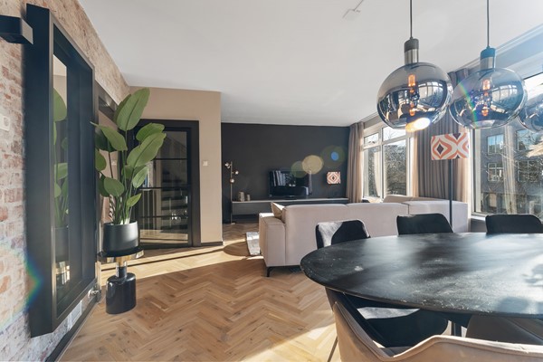 Entree op de tweede etage, lichte hal met moderne toiletruimte en trapopgang naar de derde verdieping. Ruime woonkamer met een fraaie visgraat parketvloer die bij aankoop is geschuurd. De royale woon- en eetkamer is heerlijk licht dankzij de vele ramen en de gunstige hoekligging. Vanuit elk raam kijk je uit over de straten van de binnenstad, terwijl je binnen een gevoel van rust en comfort ervaart. Er is volop ruimte voor een royale zithoek en een gezellige eethoek. Via de balkondeur haal je de stadse sfeer letterlijk naar binnen.