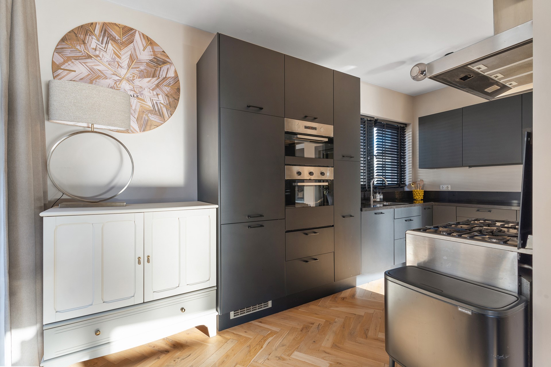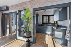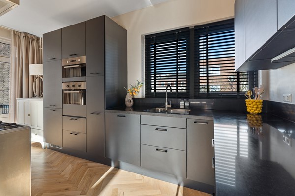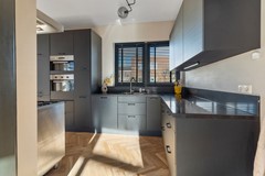 De halfopen keuken is een echte eyecatcher. De keuken is gewrapped en beschikt over veel werk- en bergruimte en is voorzien van uitgebreide inbouwapparatuur, waaronder: een oven en magnetron, een vaatwasser, een vrijstaand SMEG fornuis met oven en afzuigkap. Vanuit de keuken is er toegang tot het tweede balkon.