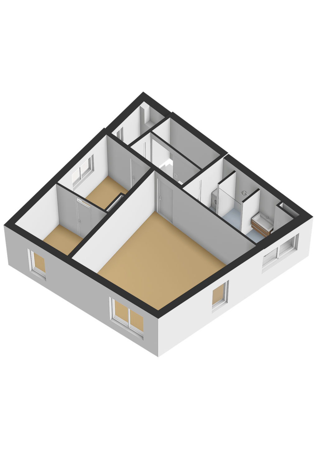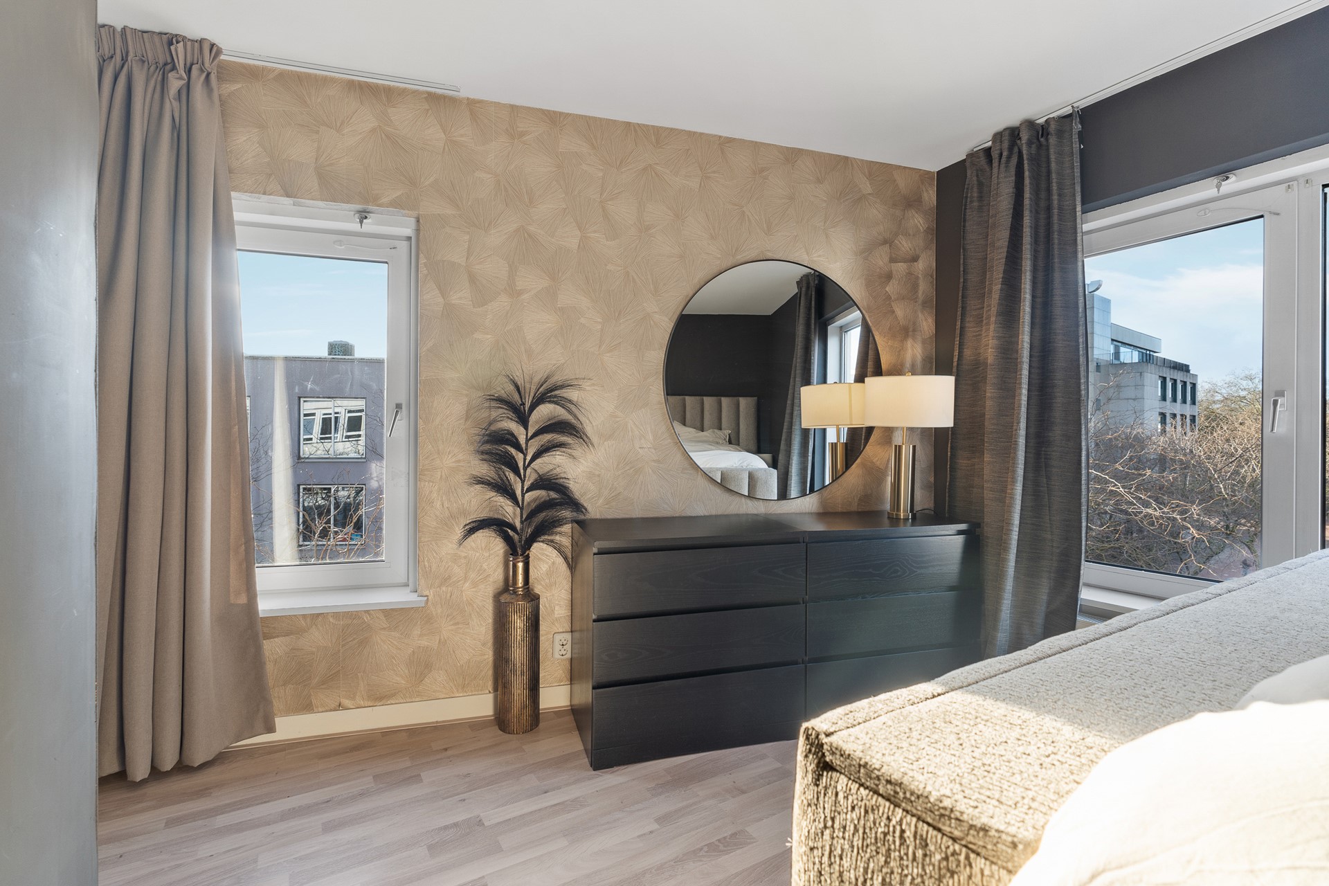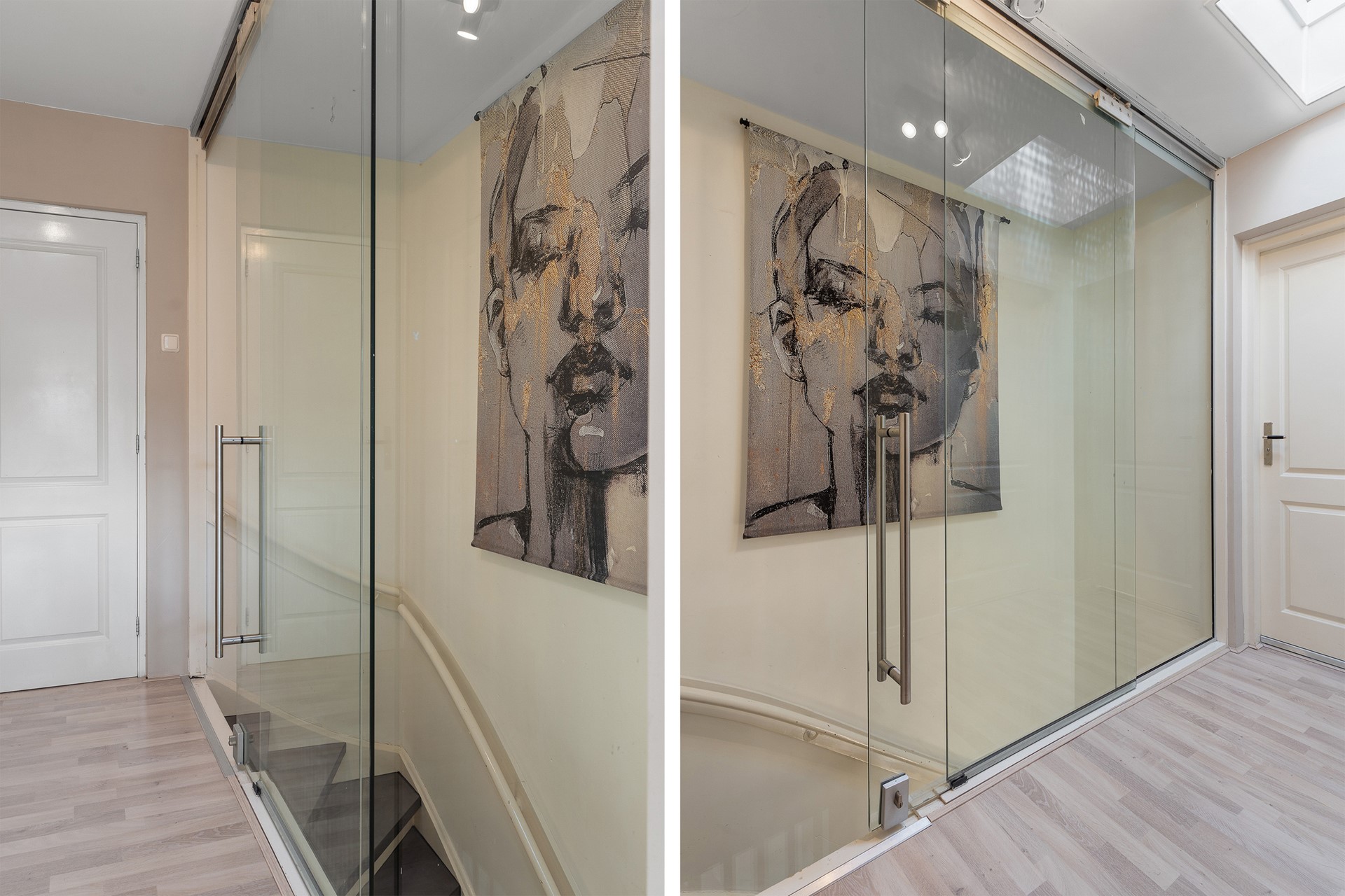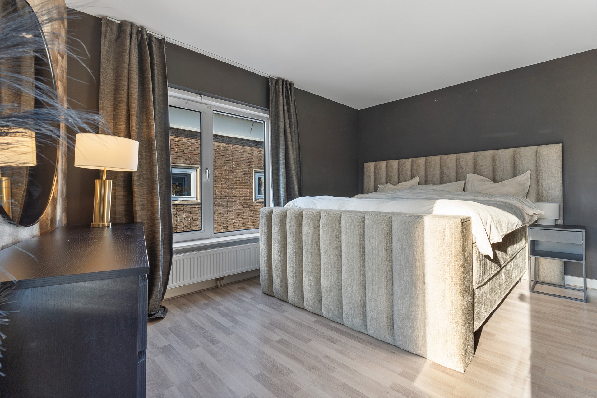 Overloop met dakraam, wat zorgt voor een prettige en natuurlijke lichtinval. Vanaf hier heb je toegang tot een tweede moderne toiletruimte, de badkamer en twee royale slaapkamers. De master bedroom heeft ramen aan twee zijden en profiteert daardoor van een mooie lichtinval. De tweede slaapkamer is eveneens ruim en licht. Beide slaapkamers en de overloop zijn afgewerkt met een nette laminaatvloer.