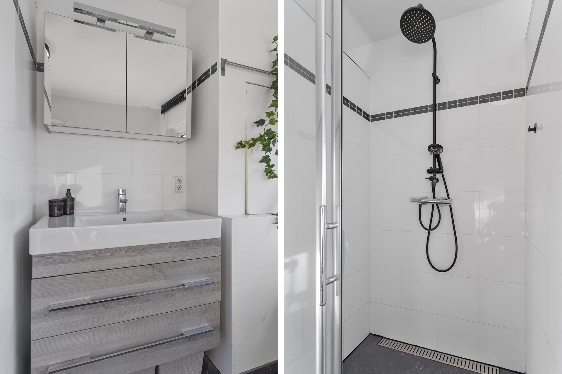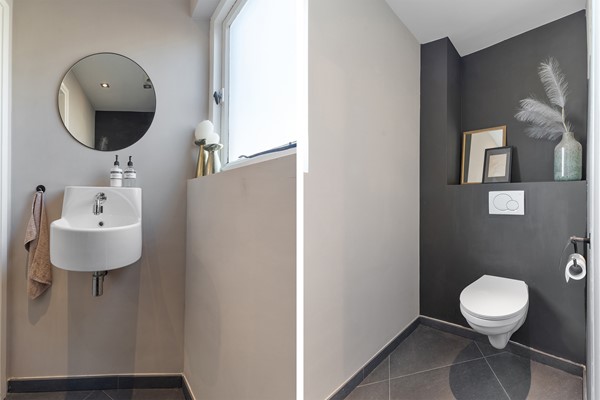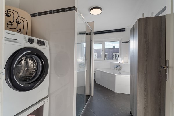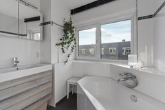 De badkamer is in 2013 vernieuwd en vormt een fijne plek om te ontspannen. De ruimte is volledig betegeld in een neutrale kleurstelling en voorzien van een hoekbad, een ruime douchecabine, een modern badkamermeubel en aansluitingen voor wasmachine en droger. Ook bevindt zich hier de CV-ketel (Remeha Avanta, bouwjaar 2012). Dankzij de grote vloertegels heeft de badkamer een luxe wellness-uitstraling.