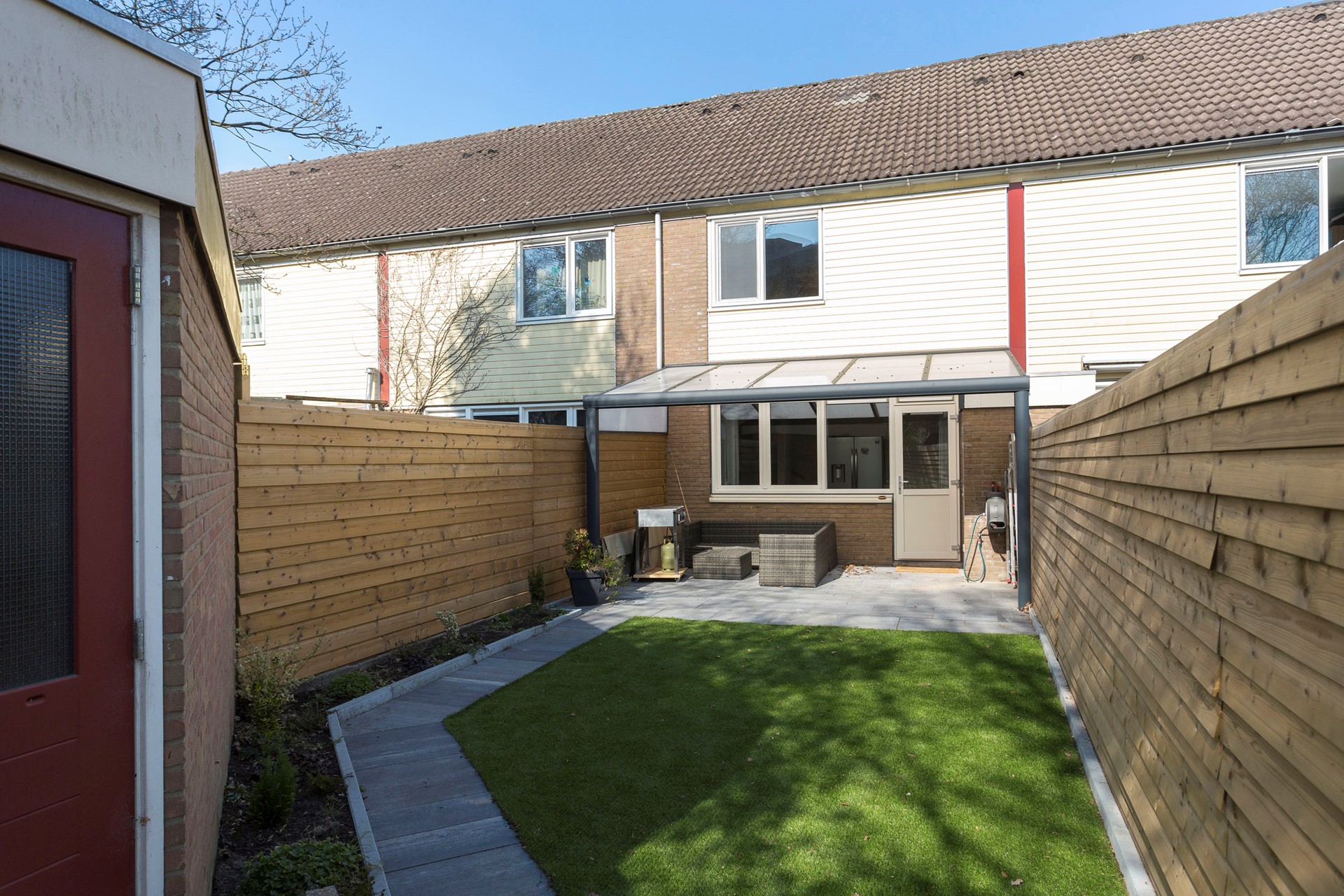 Fijne onderhoudsvriendelijke tuin gelegen op het zuidwesten met aangebouwde veranda, vrijstaande stenen berging en achterom.