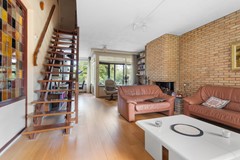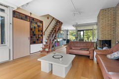 - Sfeervolle woonkamer met houten vloer, erker en open haard.