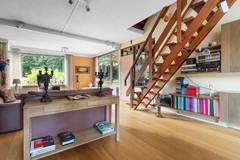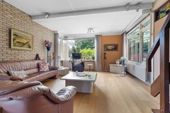 Royale woonkamer met erker, open haard en een mooie houten vloer. Via de eetkamer doorloop naar de semi open keuken met apparatuur. Toegang tot de serre met vrij uitzicht op de tuin.